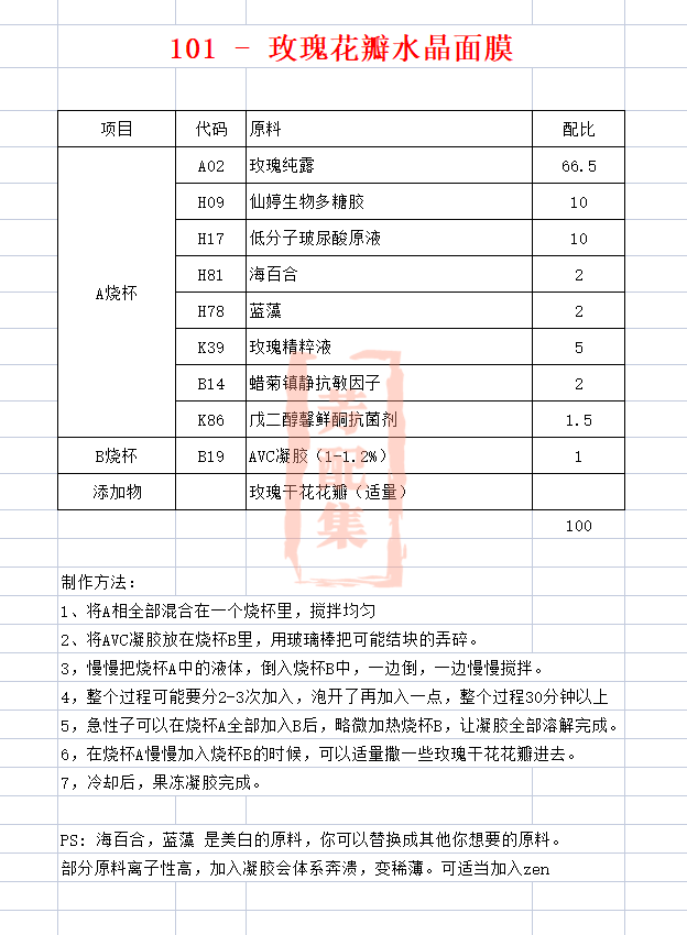 配方名称:101 - 玫瑰水晶面膜