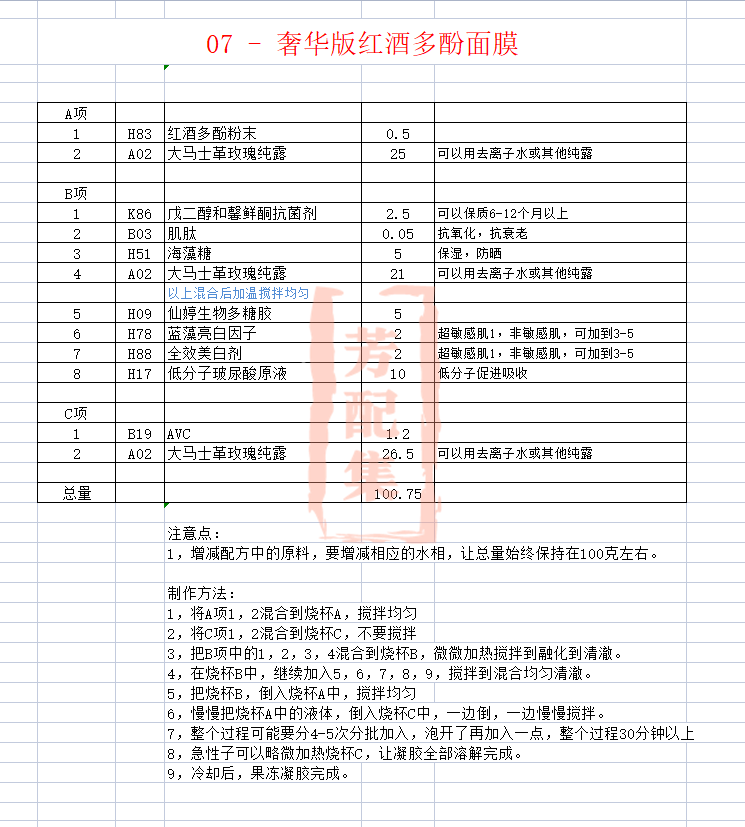 配方名称:107-奢华版红酒多酚面膜