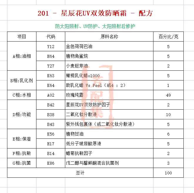 配方名称:201-星辰花UV双效防晒霜-简单版