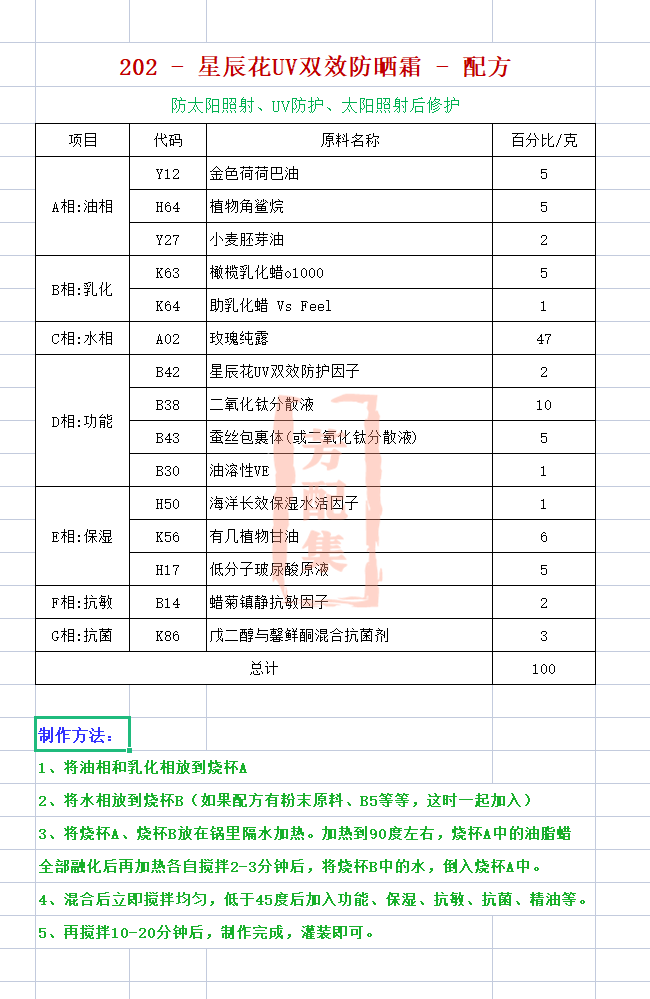 配方名称:202-星辰花UV双效防晒霜-高级版