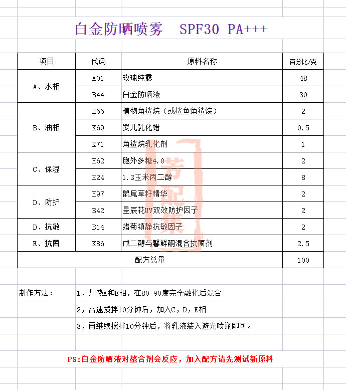 配方名称:210-白金防晒喷雾
