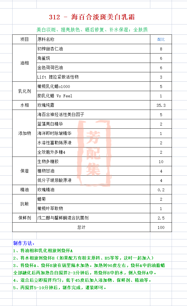 配方名称:312-海百合淡斑美白乳霜