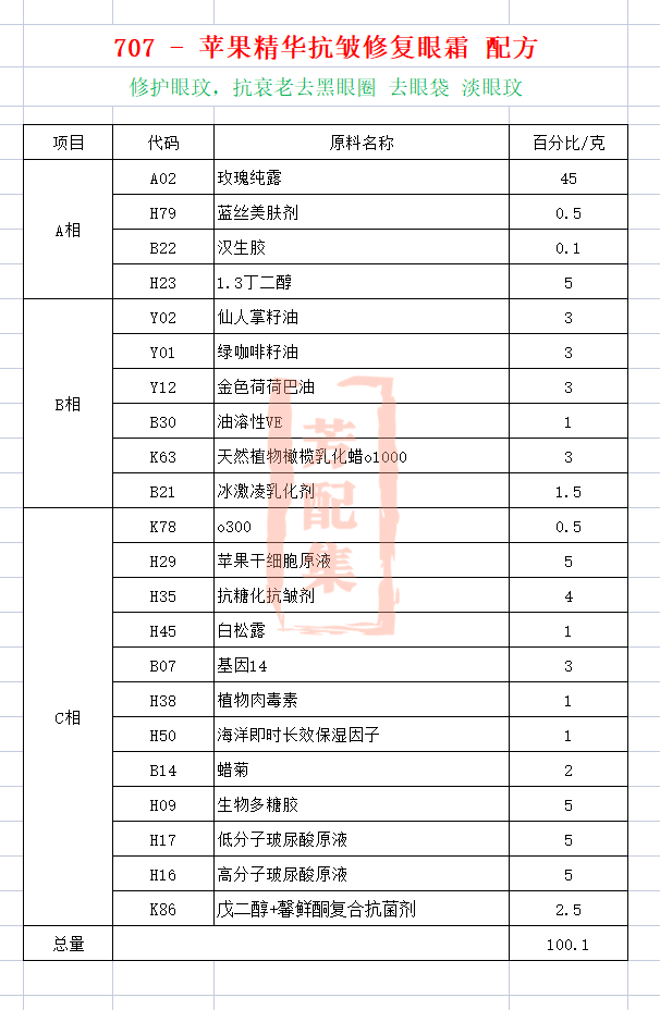 配方名称:707-苹果干细胞抗皱修复眼霜