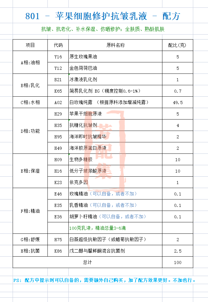 配方名称:801-苹果干细胞抗皱乳液