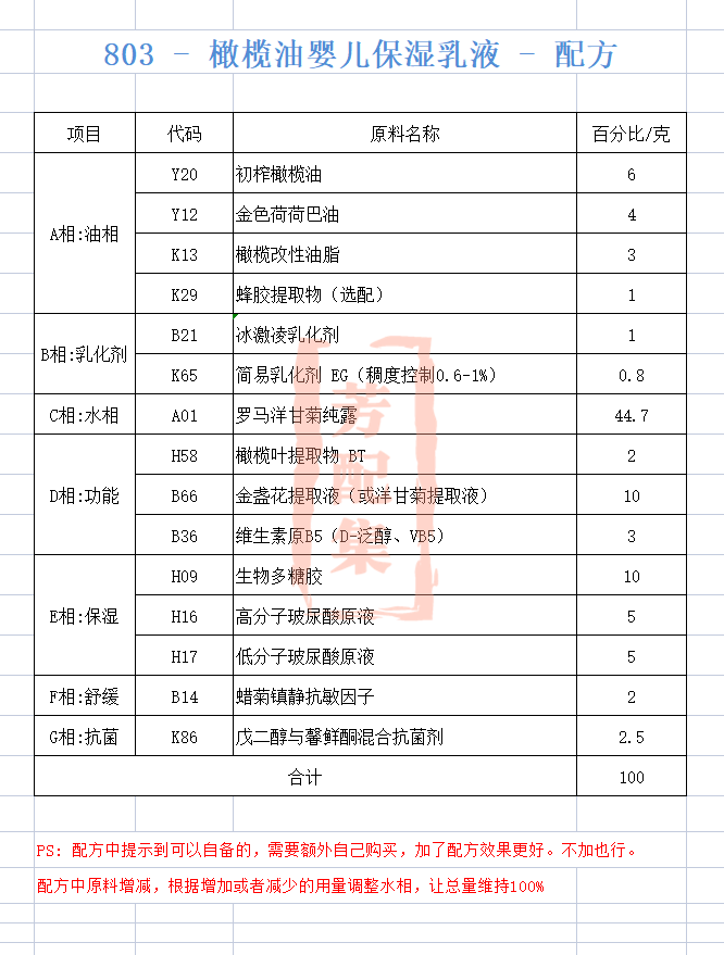 配方名称:803-橄榄油婴儿保湿乳液