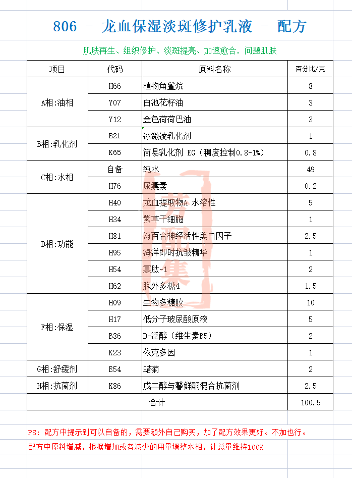 配方名称:806-龙血保湿淡斑修复乳液