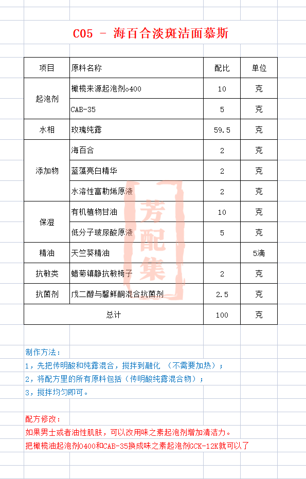 配方名称:c05-海百合淡斑洁面慕斯