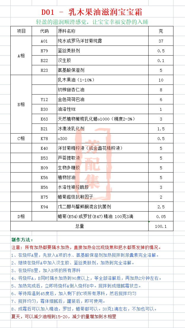 配方名称:D01-乳木果油滋润宝宝霜