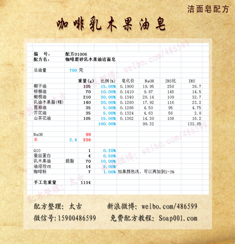 配方名称:p01006-咖啡乳木果油皂洁面皂