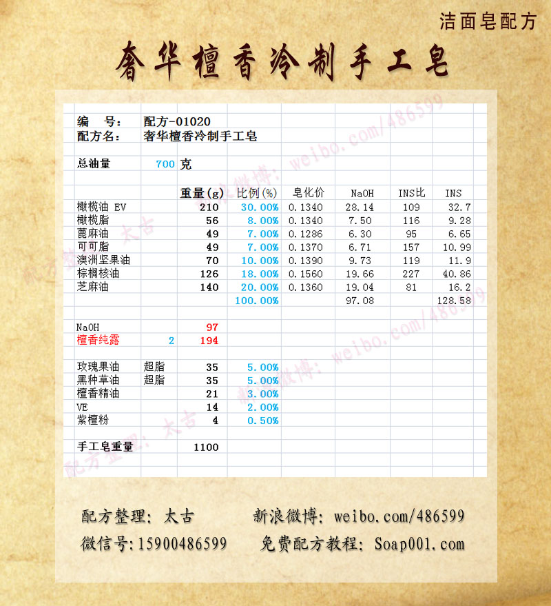 配方名称:p01020-奢华檀香冷制手工皂