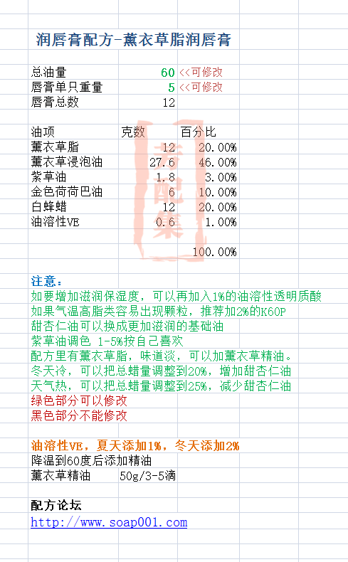 配方名称:r407-薰衣草脂润唇膏