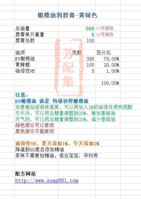 配方名称:r606-橄榄油润唇膏-黄绿色