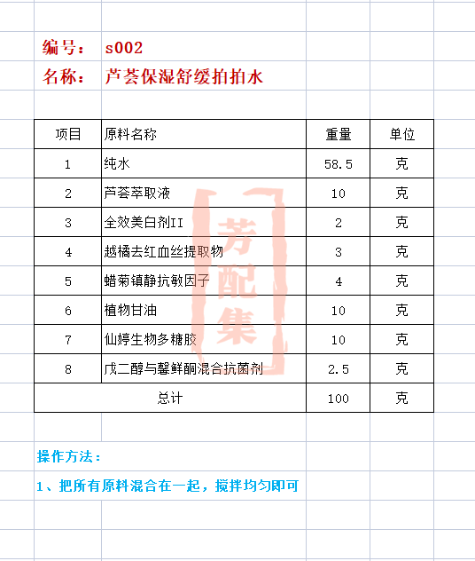 配方名称:s02-芦荟美白保湿拍拍水